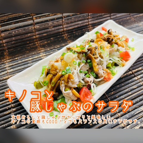 | キノコと豚しゃぶのサラダ・・・880円(税込) | 大根おろしと豚しゃぶがさっぱりと美味しい。キノコの食感がアクセント。とてもバランスの良いサラダです。 |