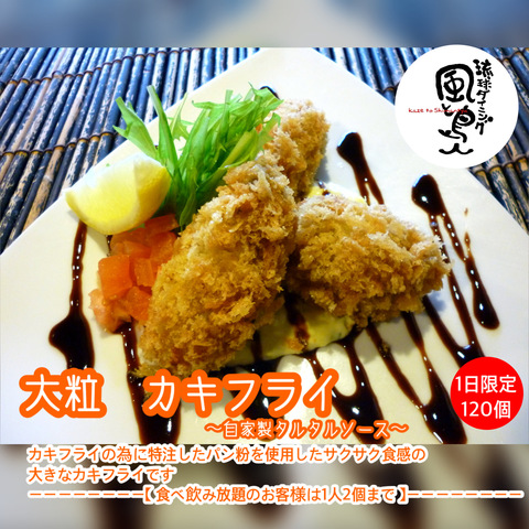 風と島人のアイデアと真心がこもった料理の数々をご来店の際は是非お楽しみ下さいねー ![]() 【 牡蠣料理 】メニューは食べ飲み放題Aプラン以上でお楽しみいただけます。 人気が出る事が予想されますので、品切れや料理の遅延を防ぐ為、ご予約の際には前もってオススメメニューをご注文いただけると幸いです。 今月もよろしくお願いします。 |