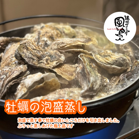 | 牡蠣の泡盛蒸し・・・13個2178円(税込) 6個1078円(税込) | ぷっくりと蒸しあがった牡蠣は牡蠣好きにはまさに至福★小牡蠣ですが味は一級品です。もちろん食べ放題プランでもオーダーOK★ |