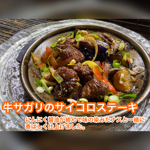 | 牛サガリのサイコロステーキ・・・980円(税込1078円) | にんにく醤油が絡んで味の染みたナスと一緒に香ばしく仕上げました。 |