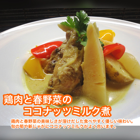 | 鶏肉と春野菜のココナッツミルク煮・・・968(税込) | 鶏肉と春野菜の美味しさが溶けだした食べやすく優しい味わい。旬の筍や新じゃがにココナッツミルクがよく合います。 |