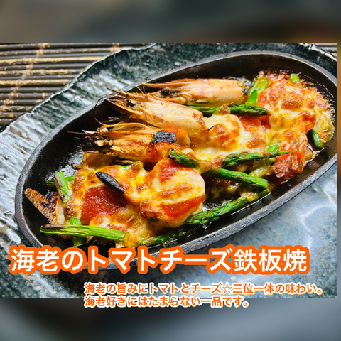 | 海老のトマトチーズ鉄板焼き・・・780円(税別) | 海老の旨味にトマトとチーズ。三位一体の味わい。海老好きにはたまらない一品です。 |