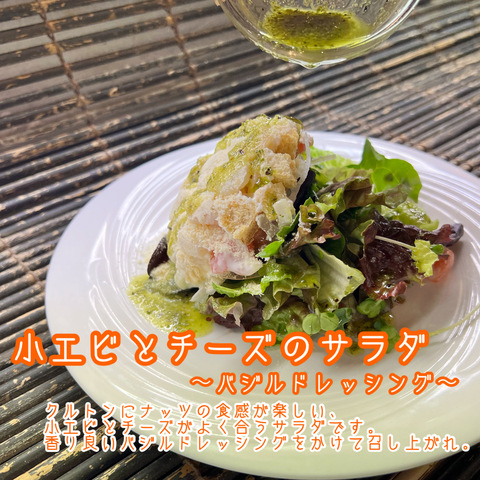 | 小エビのチーズのサラダ〜バジルドレッシング〜・・・990円(税込) | クルトンにナッツの食感が楽しい、小エビとチーズがよく合うサラダです。香りの良いバジルドレッシングをかけて召し上がり下さい。 |