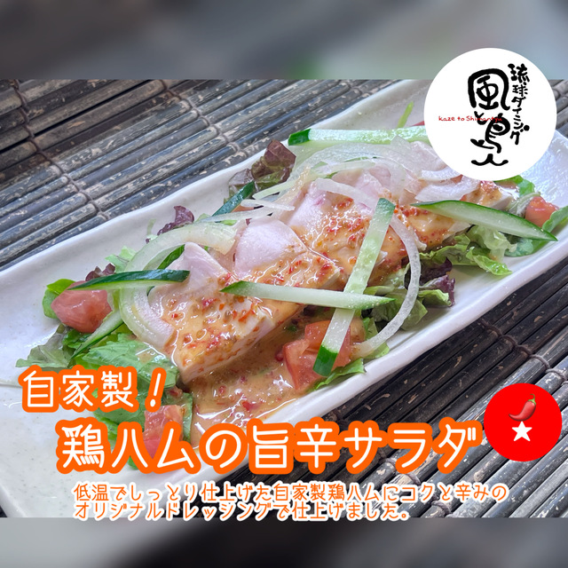 低温でしっとり仕上げた自家製鶏ハムにコクと辛味のオリジナルドレッシングで仕上げました。