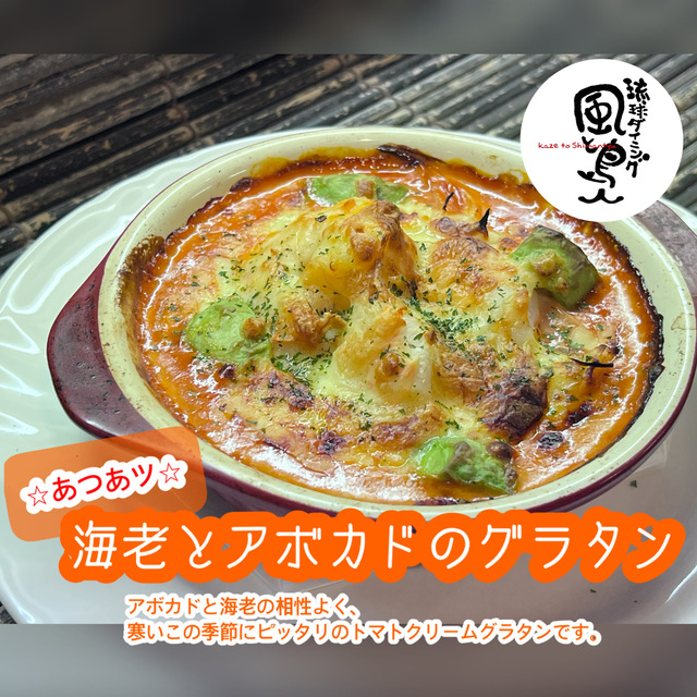 アボカドと海老の相性よく、寒いこの季節にぴったりのトマトクリームグラタンです